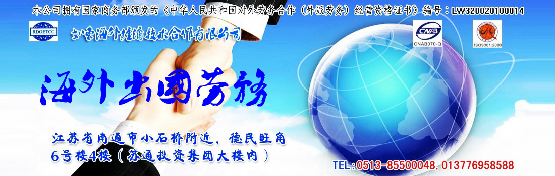 如(rú)東海外經(jīng)濟技術(shù)合作有限公(gōng)司是從事對外勞務合作的專業性公司,本公司擁有國家商務部頒發的《中華人民共和國對外勞務合作(外派勞務)經營資格證書》編號:LW320020100014。從一九(jiǔ)九五年開展勞務合作以(yǐ)來(lái),積極開拓進取,先後向日本、加拿大、新加坡、韓國等國家派遣勞務人員近3000多人。勞務合作行(háng)業主要有服(fú)裝(zhuāng)(車工、裁剪、整燙、製板、維修、車間管理)、針織業(織(zhī)布、漂染、針織、橫(héng)機、套口羊毛衫工)、建築工(gōng)程(技術人員、瓦工、鋼(gāng)筋工、拌灰工、木工、油漆工、電工、鋁合金工、水暖工等)、機械工(銑床、車床、衝床、鑽床、鑄造等)電焊工(壓力容器、亞弧焊、建築設備安裝、船舶、管道工)、遠洋捕撈(職(zhí)務船員、普通漁工、水手),高級廚師(川菜、粵菜、京菜、淮(huái)揚菜)、電子裝配、園藝、蔬菜(cài)種植(zhí)、桑蠶飼養、海、淡水養殖(zhí)、護士、翻譯(英語、日語、韓國)等(děng),日本辦事處設在日本東京(jīng)、廣島主要負責管理(lǐ)和服務日本研修生及貿易方麵的聯絡工作,國外辦事處和中國(guó)公司現有工作人員25人,專職勞務工作人員(yuán)10人,從事(shì)勞務行業均10年以上,翻譯(yì)、培訓教師5人(rén),外教2人,會計(jì)3人,業務人員(yuán)5人。